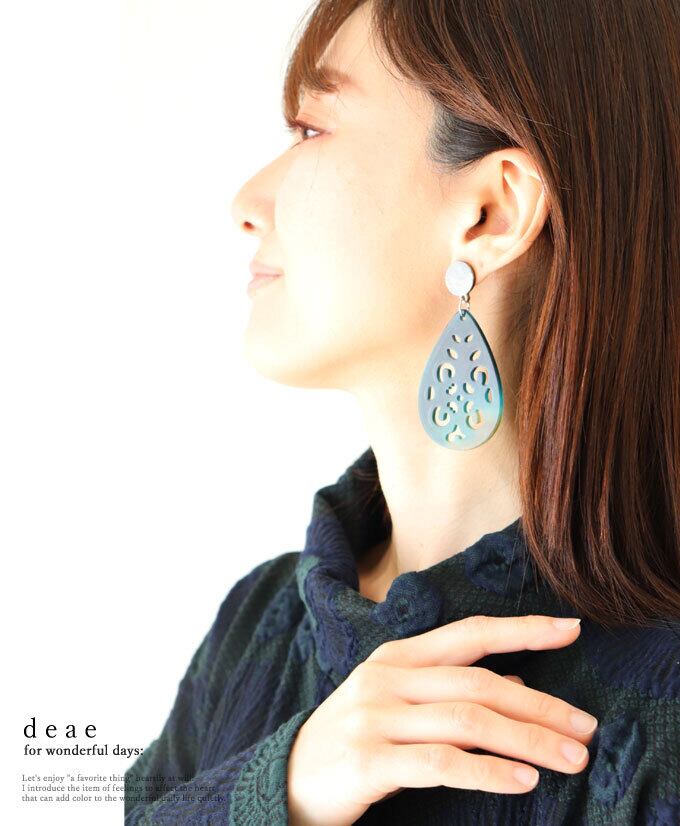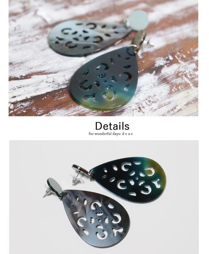 このピアスは、レトロなカービングが特徴。和を感じさせる鼈甲風の風合いが、シンプルなコーディネートに程よいアクセントをプラスしてくれます。カジュアルなお出かけからちょっとしたお出かけまで、幅広いシーンでお使いいただけます。