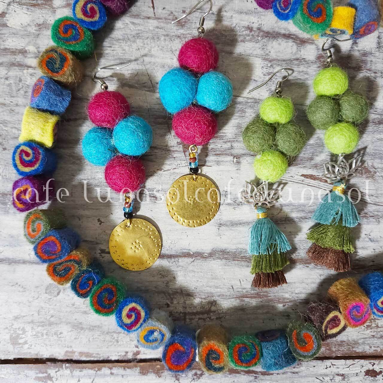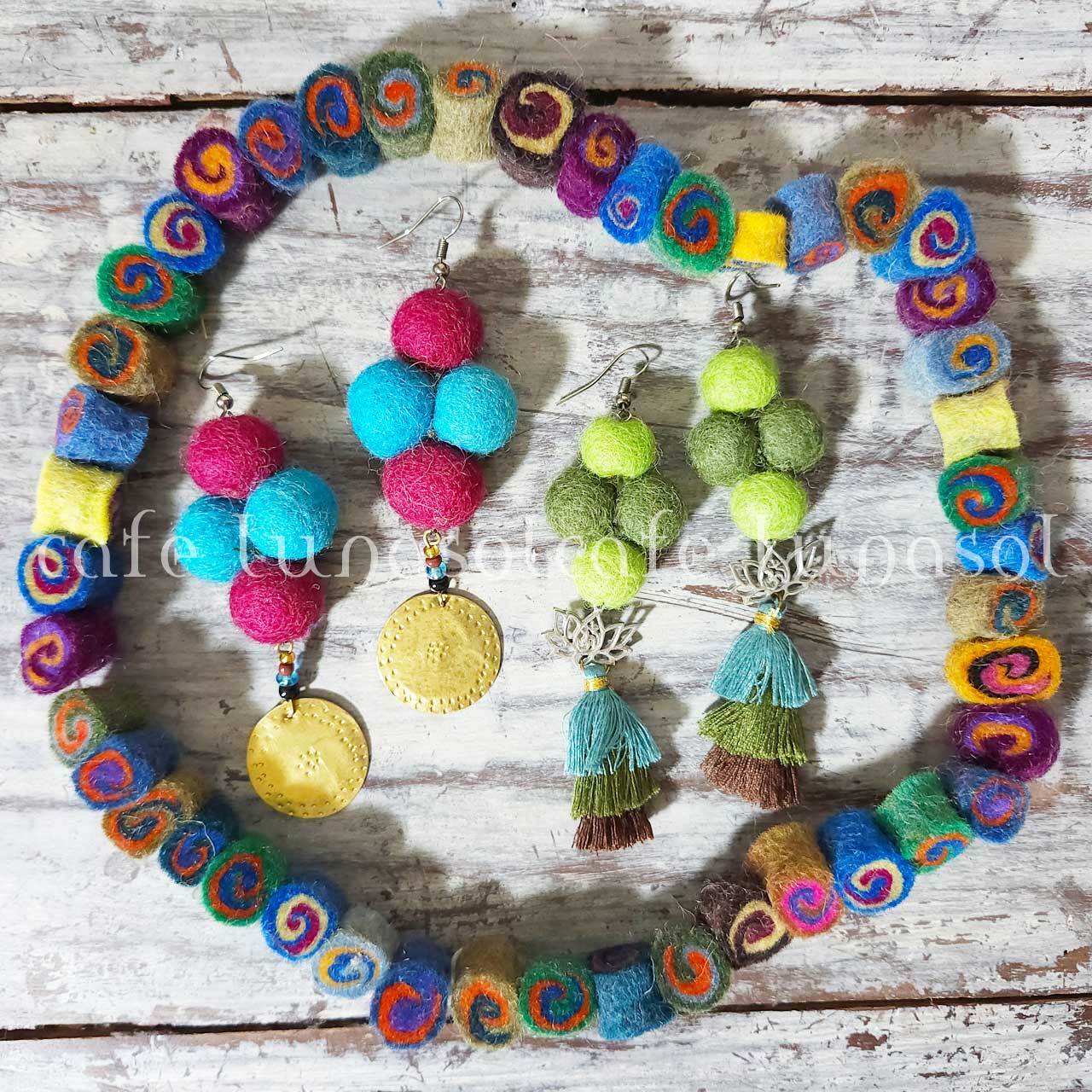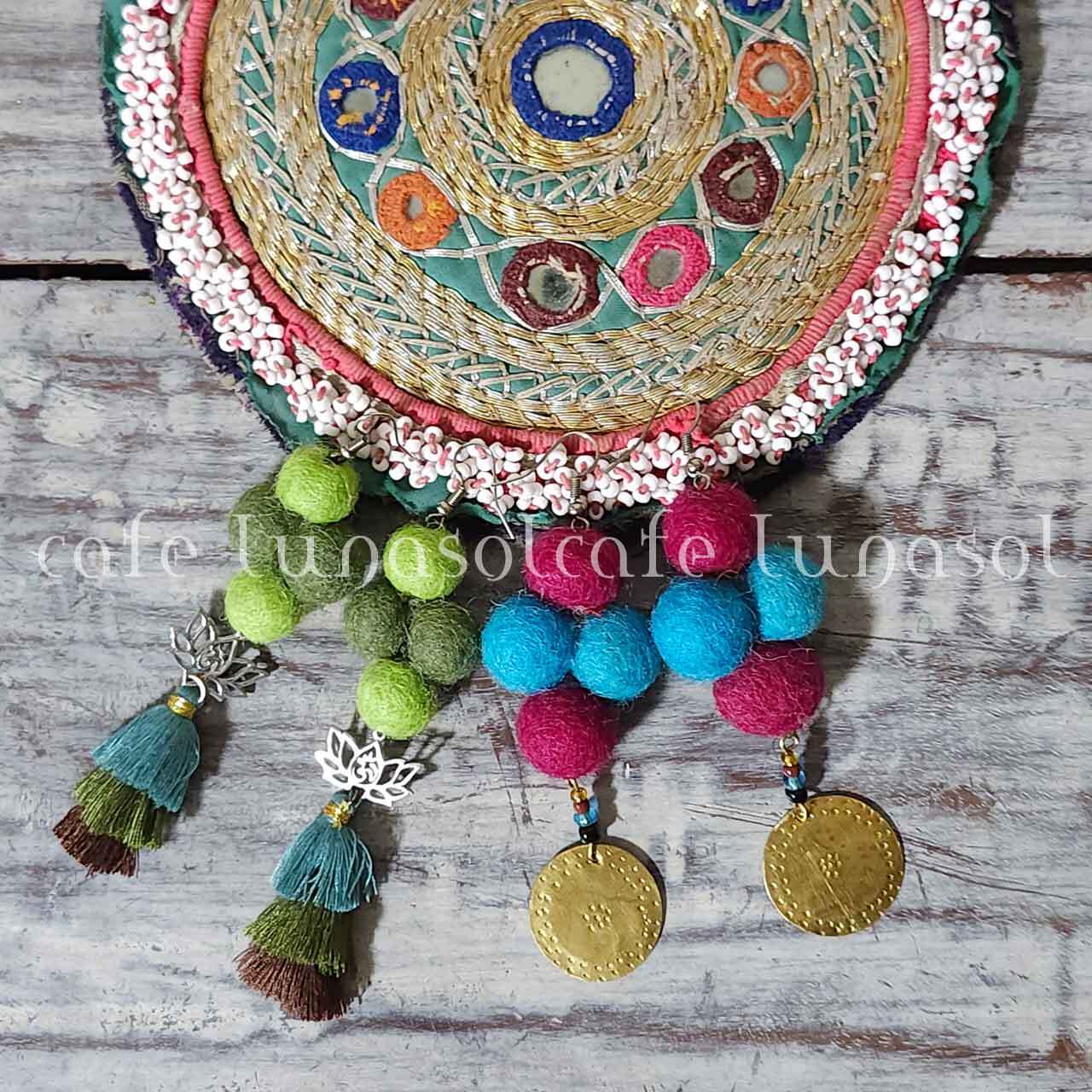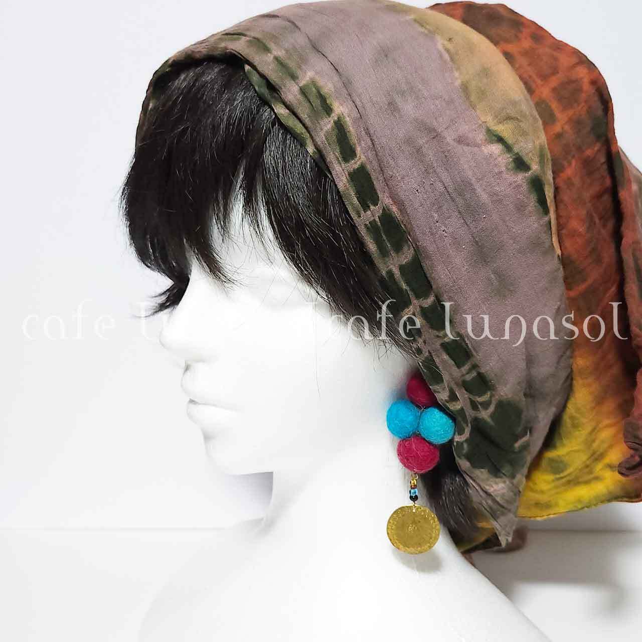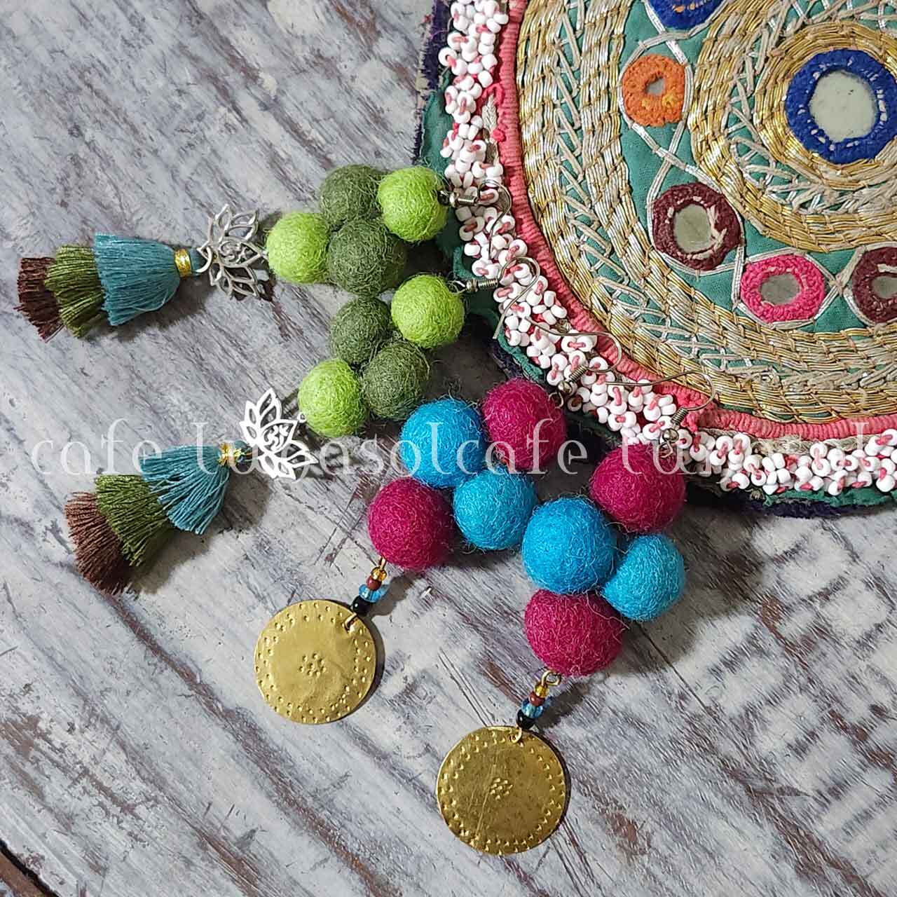 ネパールのウールポンポンのピアス ボンボンのピアス 蓮の花 ロータス タッセル 真鍮 ハンドメイド 彩り アクセント エスニック トライバル