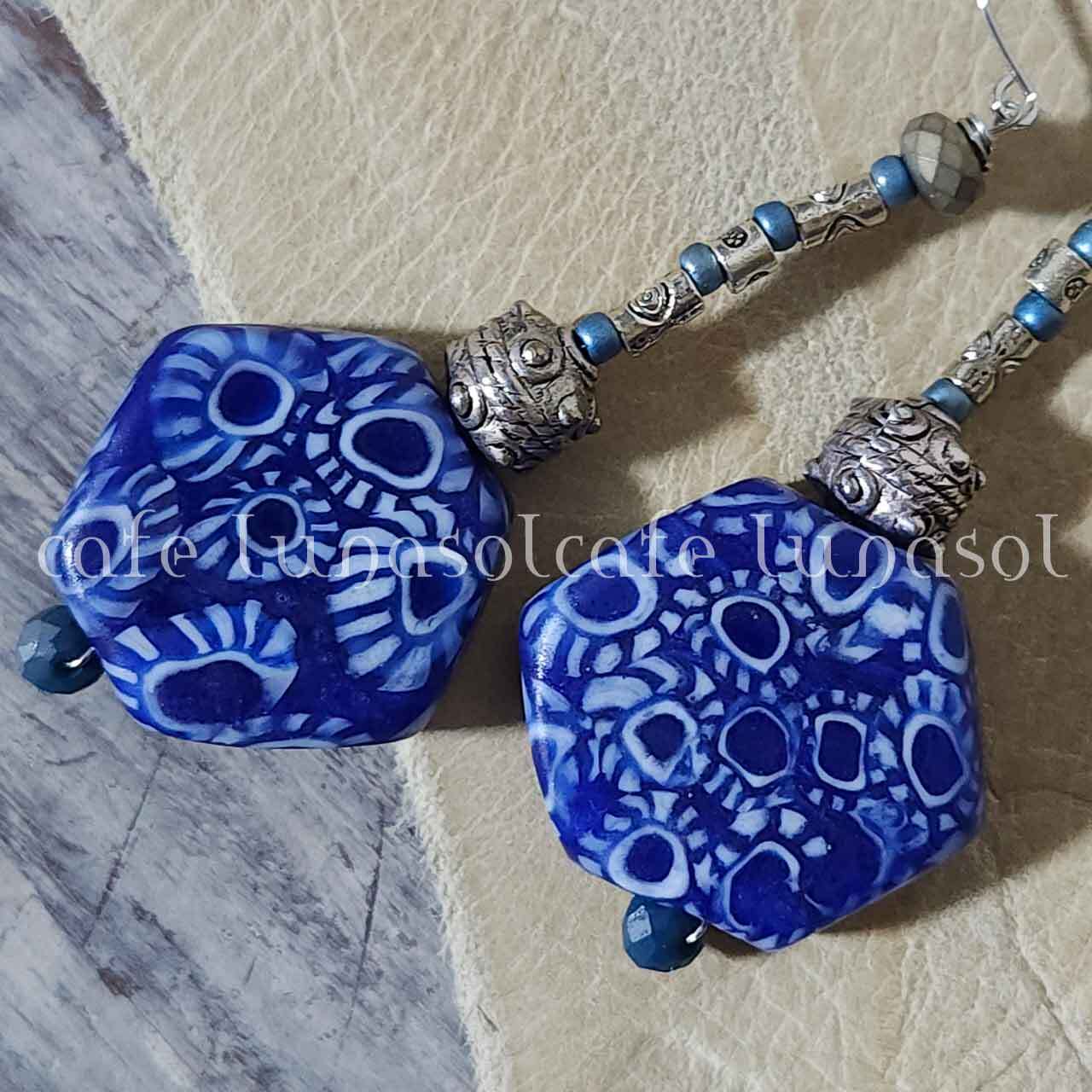 多角形とんぼ玉のピアス インドネシア、ジャワのバティック柄のガラスビーズのピアス 彩り アクセント